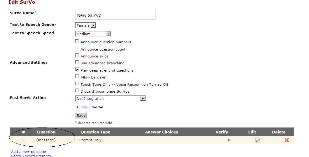 1.Advanced Services >Survo>edit>Created {message}.Please,find the screenshot for this. 2.Passing the user defined message in the code